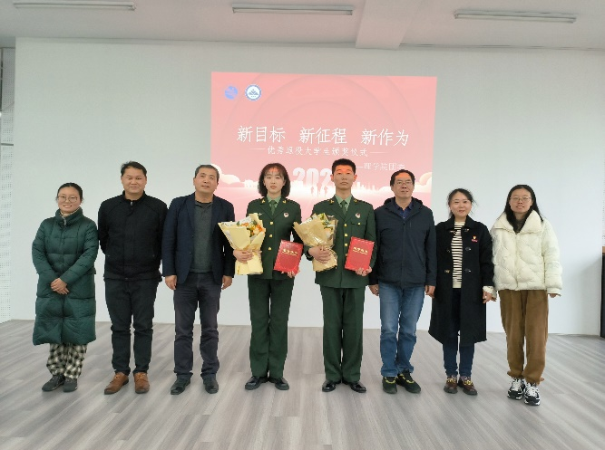 分享会上,赵宜昊、李娜两位退伍大学生分别讲述自己献身军营,在军营中培养严谨作风,锻造强健体魄的成长经历和精彩生活。殷允聪同志则是通过视频的方式分享了他的军旅生活。代海也鼓励同学们把握机遇,积极应征入伍。随后,李珺为退伍大学生们颁发荣誉证书。最后,各参会嘉宾一同与退伍大学生们合影留念。