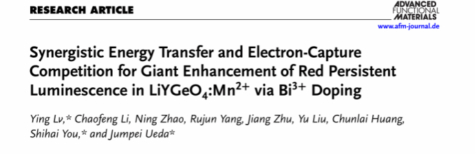 近日,我院青年教师吕营博士联合厦门大学等单位在稀土长余辉发光材料研究方面取得重要进展。该成果以“Synergistic Energy Transfer and Electron‐Capture Competition for Giant Enhancement of Red Persistent Luminescence in LiYGeO4:Mn2+ via Bi3+ Doping”为题,发表于国际期刊《先进功能材料》(Advanced Functional Materials,2024年影响因子为19)。