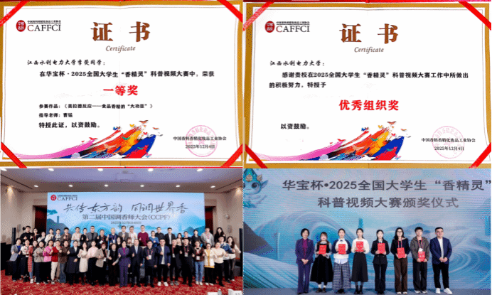近日,中国香料香精化妆品工业协会发布“华宝杯•2025全国大学生‘香精灵’科普视频大赛”评审结果,我校香料香精技术与工程专业同学参赛的作品表现亮眼,荣获一等奖1项,三等奖3项,优胜奖3项。本次大赛吸引上海交通大学、天津大学、北京工商大学、上海应用技术大学等高校约150名学子踊跃参与,大赛旨在进一步普及香料香精科学知识,提升公众对香料香精行业的认知,培养大学生创新精神与实践能力。
