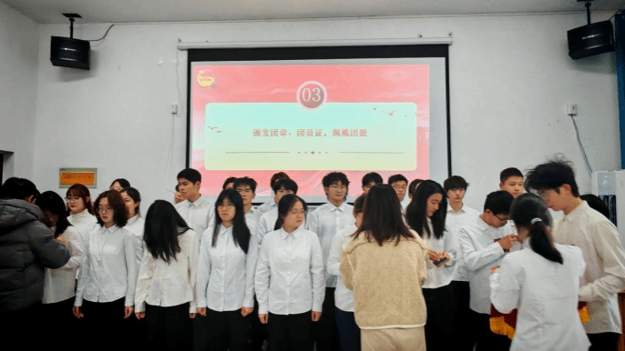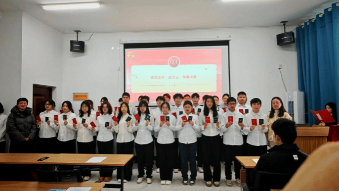 仪式伊始,全场起立奏唱国歌。随后宣读2025年下半年新团员名单,在全场瞩目下,臧秀娟、揭蕾两位老师为新团员颁发团章、团员证,并亲自为新团员佩戴团徽。随后,新团员们面向团旗,举起右拳庄严宣誓。“我志愿加入中国共产主义青年团……”铿锵有力的誓言,表达了他们的坚定决心。会上还组织学习了《中国共产主义青年团团章》中有关团员义务和权利的重要条款。