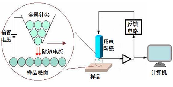 2为针尖的功函数),Z是样品与针尖之间的距离。因此,通过反馈电路控制可以调节隧穿电流的变化,这样,样品表面细微的高低起伏变化信息就会被记录下来。